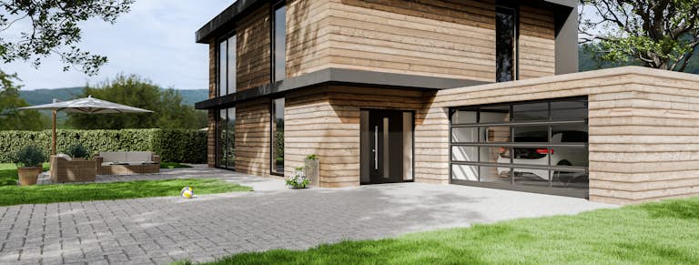 Pour les maîtres d’ouvrage ou dans le cadre de rénovations, s’il est très important que la porte de garage soit généreuse et élégante, la porte à cadre en aluminium est en tout cas le bon choix. Les portes à cadre en aluminium sont une bonne alternative aux portes de garage sectionnelles fermées et sont souvent utilisées dans les garages nécessitant plus de lumière ou dans les garages collectifs dont les places de stationnement doivent bénéficier d’une meilleure aération. La combinaison cadre en aluminium et vitrage grand format assure un aspect harmonieux de la porte et plus de luminosité dans le garage. Les espaces vitrés sont très robustes, grâce au revêtement Duratec particulièrement résistant aux rayures et disponible uniquement chez Hörmann.
